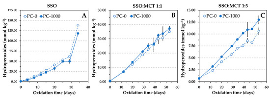 Influence of the addition of 1000 mg kg−1 phosphatidylcholine (PC) on the formation of hydroperoxides at 50 °C in different lipid substrates containing 1.16 mmol kg−1 α-tocopherol, namely, stripped sunflower oil (SSO) (A), and 1:1 (w/w) (B) and 1:3 (w/w) (C) blends of SSO with MCT. Data represent means and standard deviations (n = 3). Some of the error bars are within data points.