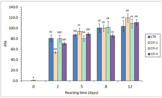 A strong FFA formation (p < 0.05) was detected in fish muscle corresponding to all batches. A remarkable correlation value with the heating time (r = 0.88–0.94, logarithmic fitting) was observed (Figure 3). In all cases, this increase was especially important (p < 0.05) after a 2-day heating time. A comparison among batches showed some differences (p < 0.05); however, a definite trend in the presence and concentration of the CFI in the heating medium could not be concluded. Compared to the CTR fish, an inhibitory effect (p < 0.05) on the FFA content was observed on day 2 (CFI-1 and CFI-3 batches), day 5 (CFI-2 batch) and day 8 (CFI-3 batch). Contrarily, fish muscle corresponding to the CTR batch showed the lowest average values at the end of the experiment.