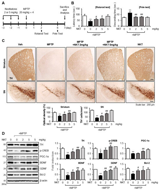 Nootkatone (NKT) and 1-methyl-4-phenylpyridinium ion (MPP+) were purchased from Sigma-Aldrich (St. Louis, MO, USA). Brusatol (BT) and MPTP were purchased from MedChemExpress (Princeton, NJ, USA) and Tokyo Chemical Industry Co., Ltd. (Tokyo, Japan), respectively. The following primary antibodies were used in this study: anti-tyrosine hydroxylase (TH), anti-p-cAMP response element-binding protein (CREB), and anti-NQO1 from Cell Signaling Technology, Inc. (Danvers, MA, USA); anti-B-cell lymphoma 2 (Bcl-2) and anti-glial cell-derived neurotrophic factor (GDNF) from Abcam (Cambridge, UK); anti-ionized calcium-binding adapter molecule1 (Iba-1) from Wako (Osaka, Japan); anti-inducible nitric oxide synthase (iNOS) from BD Biosciences (San Jose, CA, USA); anti-tumor necrosis factor (TNF-α), anti-interleukin (IL)-6, anti-Toll-like receptor 2 (TLR2), anti-TLR4, anti-IL-10, anti-Nrf2, and anti-transforming growth factor-beta (TGF-β) from Santa Cruz Biotechnology (Santa Cruz, CA, USA); anti-peroxisome proliferator-activated receptor-gamma coactivator-1 alpha (PGC-1α) and anti-neuronal nuclear (NeuN) from Merck-Millipore (Billerica, MA, USA); anti-HO-1 and anti-MnSOD from Enzo Life Sciences (Farmingdale, NY, USA); anti-4-hydroxy-2E-nonenal (4-HNE) from Alpha diagnostic Intl Inc. (San Antonio, TX, USA); anti-8-hydroxy-2′-deoxyguanosine (8-OHdG) from Antibodies-online (Aachen, German); anti-γ-glutamyl cysteine ligase-modulator subunit (GCLM) from GeneTex (Irvine, CA, USA); anti-cyclooxygenase-2 (COX-2), anti-IL-1β, and anti-γ-glutamyl cysteine ligase-catalytic subunit (GCLC) from MyBioSource (San Diego, CA, USA); and anti-glial fibrillary acidic protein (GFAP), anti-brain-derived neurotrophic factor (BDNF), and anti-β-actin from Sigma-Aldrich. The detailed catalogue numbers and dilution folds of each antibody are summarized in Tables S1 and S2.