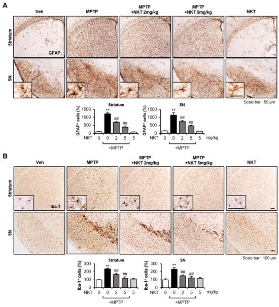 Effects of NKT on astrocyte and microglial activation in the brains of MPTP-treated mice. (A) IHC staining for GFAP (astrocyte marker) in the striatum and SN (n = 4–5 per group, 3 sections/brain). Quantitative analysis was performed by measuring the number of GFAP+ cells (bottom panel). (B) IHC staining for Iba-1 (microglial marker) in the striatum and SN (n = 4–5 per group, 3 sections/brain). The number of Iba-1+ cells was counted to undertake quantitative analysis (bottom panel). The data are presented as the mean ± SEM. ** p < 0.01 vs. control group; ## p < 0.01 vs. MPTP-treated group.