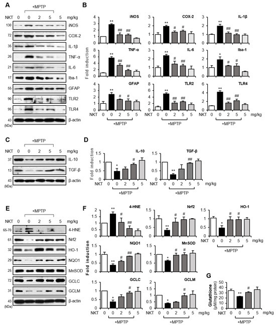 Effects of NKT on the expressions of pro-inflammatory, anti-inflammatory, and antioxidant molecules in the brains of MPTP-treated mice. (A) Western blot data showing the effects of NKT on the protein expressions of iNOS, COX-2, pro-inflammatory cytokines, Iba-1, GFAP, TLR2/4 in the SN of MPTP mice (each group n = 6–7). (B) Quantification of Western blot data. (C) Effects of NKT on anti-inflammatory cytokines such as TGF-β and IL-10 in the SN of MPTP mice (each group n = 6–7). (D) Quantification of Western blot data. (E) Western blot data showing the effects of NKT on 4-HNE, Nrf2, HO-1, NQO1, MnSOD, GCLC, and GCLM in the SN of MPTP mice (each group n = 6–7). (F) Quantification of Western blot data. (G) Effect of NKT on intracellular GSH level in the SN of MPTP mice. The data are presented as the mean ± SEM. * p < 0.05 vs. control group; ** p < 0.01 vs. control group; # p < 0.05 vs. MPTP-treated group; ## p < 0.01 vs. MPTP-treated group.