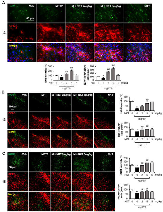 NKT increased astroglial Nrf2, HO-1, and NQO1 expression in the brains of MPTP-treated mice. (A) Immunofluorescence (IF) staining results showing Nrf2 and GFAP expression in the SN of MPTP mice (n = 6–7, 3 sections/brain). The upper panel has representative images, and the quantification of Nrf2 expression and Nrf2+/GFAP+/DAPI+ cells is shown in the bottom panel. (B,C) IF staining results showing HO-1/GFAP (B) and NQO1/GFAP (C) expression in the SN of MPTP mice (n = 6–7, 3 sections/brain). Representative images are shown in the left panel, and the quantification of HO-1, NQO1 expression, and HO-1+/GFAP+, NQO1+/GFAP+ cells is shown in the right panel. The data are presented as the mean ± SEM. * p < 0.05 vs. control group; ** p < 0.01 vs. control group; # p < 0.05 vs. MPTP-treated group; ## p < 0.01 vs. MPTP-treated group.