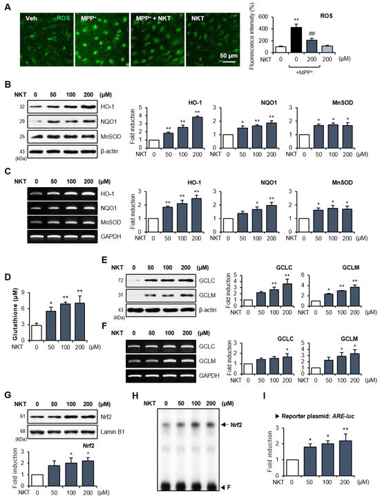 Double IF staining was performed to identify the source cell types for Nrf2, HO-1, and NQO1 expression in NKT/MPT-treated mice. MPTP treatment significantly reduced the expression of Nrf2, HO-1, and NQO1 and the number of Nrf2+, HO-1+, and NQO1+ cells that co-localized with astrocytes in the SN region, whereas NKT restored the expression of Nrf2, HO-1, and NQO1 in astrocytes (Figure 4A–C). However, NKT treatment had no significant effect on the number of Nrf2+ cells co-localized with microglia and only slightly increased the number of Nrf2+ cells co-localized with neurons (Figure S1). In accordance with this, NKT treatment had no significant effect on the number of HO-1+ or NQO1+ cells co-localized with microglia or neurons, as shown by Iba-1 or NeuN staining (Figures S2 and S3). Next, we examined the antioxidant effects of NKT on primary rat astrocytes. IF staining revealed that NKT inhibited ROS production in MPP+-treated astrocytes (Figure 5A). To verify the effects of NKT on Nrf2 signaling, rat primary astrocytes were treated with NKT, and the expressions of antioxidant enzymes and Nrf2 activity were measured. Western blot and RT-PCR analyses showed that NKT induced the expression of HO-1, NQO1, and MnSOD at the mRNA and protein levels (Figure 5B,C). Moreover, NKT increased the intracellular GSH levels and the expression of GCLC and GCLM, which are the rate-limiting enzymes in GSH synthesis (Figure 5D–F). When we examined the effect of NKT on upstream Nrf2 signaling, we found that NKT increased the nuclear translocation, DNA binding, and transcriptional activity of Nrf2 in primary astrocytes (Figure 5G–I).