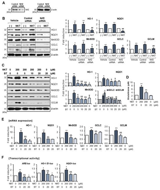 Nrf2 siRNA or Nrf2-specific inhibitor, brusatol, reversed NKT-mediated upregulation of antioxidant molecules in rat primary astrocytes. (A,B) Cells were transfected with Nrf2 siRNA or control siRNA and then treated with NKT for 6 h to detect Nrf2 and antioxidant enzyme levels (n = 3). Western blot analysis was performed to confirm Nrf2 knockdown (A) and the expression of antioxidant enzymes (B). The left panel shows representative blots, and the right panel shows quantification data. * p < 0.05 vs. control cells; ** p < 0.01 vs. control cells; # p < 0.05 vs. control siRNA-transfected cells in the presence of NKT; ## p < 0.01 vs. control siRNA-transfected cells in the presence of NKT. (C,D) Cells were incubated with BT for 1 h, followed by NKT for 6 h to detect antioxidant enzymes (C) and GSH levels (D). The right panel depicts the quantification of Western blot data. (E) Quantitative RT-PCR data showing the effect of NKT on mRNA expressions of antioxidant enzymes and GCLC/GCLM. (F) Effect of NKT on transcriptional activities of ARE-luc, HO-1 E1-luc, or NQO1-luc (n = 3). The data are presented as the mean ± SEM. * p < 0.05 vs. control cells; ** p < 0.01 vs. control cells; & p < 0.05 vs. NKT-treated cells; && p < 0.01 vs. NKT-treated cells.