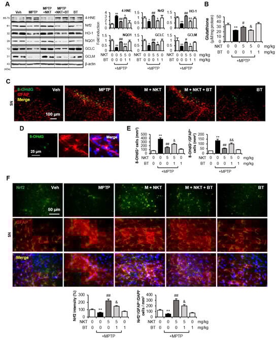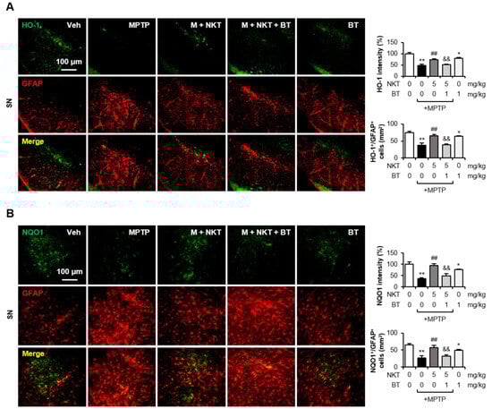 To investigate whether Nrf2 also controls oxidative stress and antioxidant enzyme expression in vivo, mice were administered BT 6 h prior to NKT injection. Western blot analysis showed that BT reversed the NKT-mediated inhibition of 4-HNE and the upregulation of Nrf2, HO-1, NQO1, GCLC, GCLM, and GSH levels in the SN (Figure 7A,B). IF staining showed that NKT inhibited the production of 8-OHdG, a product of oxidative damage from 2-deoxyguanosine, which is widely utilized as an oxidative stress marker, in astrocytes of the SN (Figure 7C–E). BT reversed the inhibitory effect of NKT on 8-OHdG levels, suggesting that Nrf2 mediates the antioxidant effect of NKT. Next, we examined the effects of BT on astrocytic Nrf2, HO-1, and NQO1 expression in MPTP/NKT-treated mice. Double IF staining showed that BT reversed NKT-induced Nrf2 expression and reduced the number of Nrf2+/GFAP+ cells in the SN region (Figure 7F). Similarly, NKT-induced HO-1 and NQO1 expression, and the number of HO-1+/GFAP+ and NQO1+/GFAP+ cells, were reversed by BT treatment (Figure 8A,B). These results suggest that Nrf2 mediates NKT-induced HO-1 and NQO1 expression in astrocytes of MPTP mice.