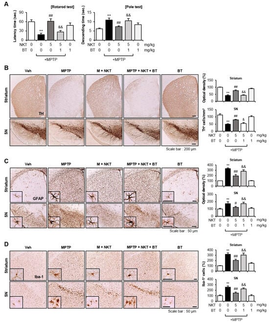 Brusatol reversed the effects of NKT on locomotor activities, dopaminergic neuronal cell death, and astrocyte/microglial activation in MPTP-treated mice. (A) Rotarod and pole tests were carried out two and six days following MPTP injection, respectively (each group n = 10–12). (B) IHC staining for TH in the striatum and SN (n = 5–6 per group). The number of TH+ cells in the SN and the optical density of TH+ fibers in the striatum were measured quantitatively (right panel). (C) IHC staining for GFAP in the striatum and SN (n = 5–6 per group). The optical density of GFAP+ cells was measured for quantitative analysis (right panel). (D) IHC staining for Iba-1 in the striatum and SN (n = 5–6 per group). The number of Iba-1+ cells was counted for quantitative analysis (right panel). The data are presented as the mean ± SEM. ** p < 0.01 vs. control group; # p < 0.05 vs. MPTP-treated group; ## p < 0.01 vs. MPTP-treated group; & p < 0.05 vs. MPTP + NKT-treated group; && p < 0.01 vs. MPTP + NKT-treated group.