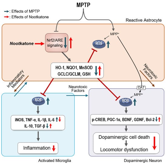 Based on these findings, we propose a plausible mechanism for NKT’s actions in MPTP-treated mice (Figure 11). MPTP administration increases astrocyte activation and decreases Nrf2/ARE signaling and antioxidant enzyme expression. The inflammatory mediators secreted from reactive astrocytes promote the activation of microglia and the production of ROS and pro-inflammatory factors. In astrocytes, MPTP is converted into the toxic metabolite MPP+, which is taken up by dopaminergic neurons via dopamine transporters. MPP+ then increases ROS production through mitochondrial complex I inhibition, while decreasing neurotrophic factor expression. Furthermore, the release of neurotoxic factors by activated microglia and astrocytes promotes dopaminergic neuronal cell death, leading to locomotor dysfunction. NKT treatment enhances astroglial Nrf2 signaling and the expression of HO-1, NQO1, MnSOD, and GSH. The antioxidant molecules may operate together to reduce ROS production in astrocytes and neighboring neuronal and microglial cells, resulting in the inhibition of neuroinflammation, dopaminergic neuronal death, and subsequent locomotor dysfunction. The Nrf2-specific inhibitor, brusatol, dramatically inhibited all the aforementioned actions of NKT, indicating that Nrf2 functions as a master regulator of the neuroprotective, anti-inflammatory, and antioxidant effects of NKT.
