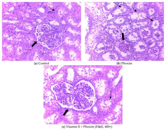 Histopathologic sections of piglets’ kidneys were observed in Figure 1. (a) The control group showed the normal appearance of renal glomeruli (thick arrow) and renal tubule (thin arrow). (b) Phoxim-exposed piglets showed renal glomerular atrophy (thick arrow) and renal interstitial fibrosis (thin arrow). (c) The group of vitamin E + phoxim showed normal glomeruli (thick arrow) and tubules in the kidney (thin arrow).