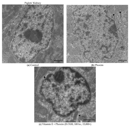 Transmission electron microscopy of piglets’ kidney (H-7650, 100 kv, 15,000×): In vivo, (a) Control group showed the normal appearance of nephrocytes. (b) After exposure to phoxim, the mitochondria gradually become swollen (thin arrow), and the number of mitochondria decreases. (c) The mitochondria were slightly swollen (thin arrow) in the vitamin E + phoxim group.