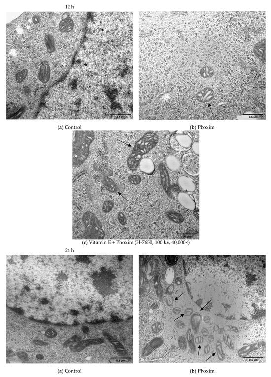 In vitro, phoxim induced the mitochondria to swell, the internal crest blurred and fractured, and a small amount of vacuolation appeared for 12 h. For 24 h, phoxim induced the deformation and disappearance of mitochondrial membranes. There were a large number of vacuoles that appeared in mitochondria with the addition of phoxim for 24 h. The mitochondria were slightly swollen in the vitamin E + phoxim group.
