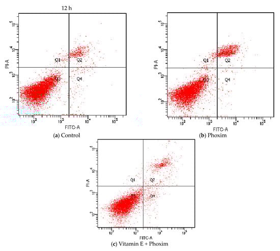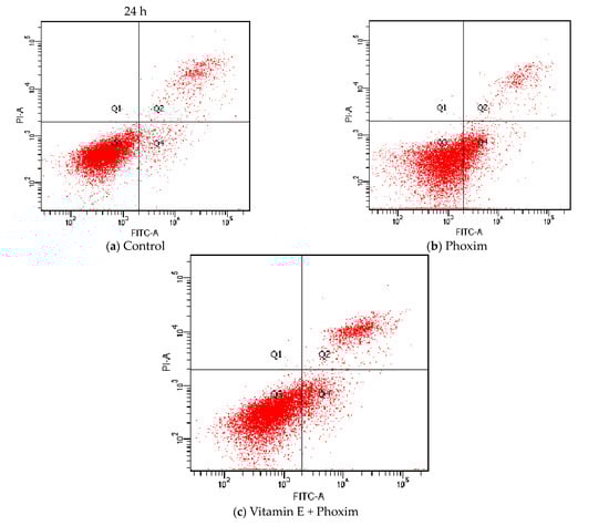 Regarding cell apoptosis rate (Table 6 and Figure 4), phoxim significantly increased the apoptotic rate of the PK15 cells for 24 h (p < 0.01), and there was no significant difference between the control group and vitamin E + phoxim group (p > 0.05).