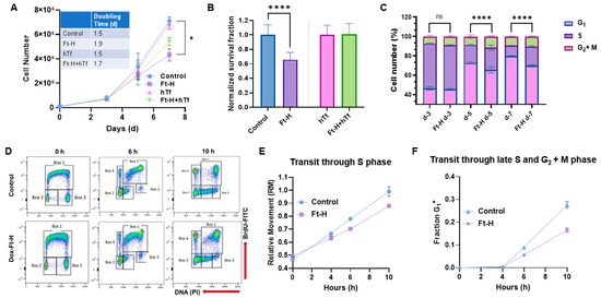 Iron depletion inhibits H1299 Ft-H C4 tumor cell growth by delaying cell cycle progression through the S-phase. (A) Ft-H was overexpressed in H1299 Ft-H C4 cells with 1 µg mL−1 doxycycline treatment over 7 d. The cell numbers were counted at 3, 5, and 7 d of exponential growth of the cells, and plotted as a cell-growth curve. An amount of 200 µg mL−1 hTf was used to supplement the control and Ft-H-expressing H1299 cells with iron over the same time as the doxycycline treatment. A nonlinear regression exponential growth equation was used to calculate the doubling time (d). R2 values > 0.94; n = 3 separate experiments; error bars are SEM; * indicates significantly different doubling times. (B) Ft-H was overexpressed in H1299 Ft-H C4 cells over 48 h and clonogenic survival was measured. The same dose of hTf (200 µg mL−1 hTf) was used to supplement the control, Ft-H-overexpressed, and iron-depleted cells with iron, and the clonogenic survival of each treatment was measured. (C) The asynchronized control and Ft-H-overexpressing cells of H1299 Ft-H C4 over 3, 5, and 7 days (d-3, d-5, and d-7) were collected, fixed with ethanol, and stained with propidium iodide (PI) to determine the DNA content and cell cycle phase distributions (G1, S, and G2 + M). (D) The control and 48 h Ft-H-overexpressing cells of H1299 Ft-H C4 were incubated with BrdU at time 0 and chased with thymidine for an additional 6 and 10 h. Scatter plot histograms of each time point were displayed as BrdU-FITC fluorescence (Y-axis) and PI-DNA content (X-axis). Cell cycle progression was calculated following the description found in [25] which is also described in Figure S5. (E) The relative movement (RM) was calculated to measure the cells progression through the S-phase. (F) The fraction of cells in the G1 of the daughter generation was calculated to measure the progression of the BrdU-positive S-phase cells through the G2 and M phases. ns refers to non-significant (n = 3; * p < 0.05, **** p < 0.0001).