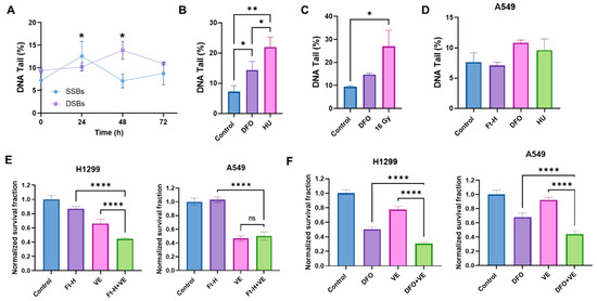 Based on the previously observed S-phase accumulation and DNA synthesis delay, it was hypothesized that the Ft-H induces an impairment in cell survival, resulting from DNA replication stress and DNA damage [27,28]. Consistent with this hypothesis, the Ft-H caused a time-dependent increase in single-stranded and double-stranded DNA breaks (SSBs and DSBs) in the H1299 cells (Figure 3A). The SSBs induced by the Ft-H peaked at 24 h (+75%) and then decreased to basal levels by 48 h in the H1299, while the DSBs peaked at 48 h (+78%). Furthermore, DFO treatment resulted in both SSBs and DSBs similar to those resulting from the replication stress-inducing agents, hydroxyurea (HU) and 16 Gy radiation, respectively (Figure 3B,C). Furthering the observed cell specificity, these effects were not observed in the A549 cells that were Ft-H overexpressed and, while treatment with DFO was able to promote SSBs, it did not reach statistical significance (Figure 3D). Since replication stress-associated replication fork stalling and breakage activates the ATR DNA damage response [29,30], we hypothesized that Ft-H overexpression would sensitize NSCLC cell lines to ATR inhibition. Consistent with our hypothesis, 24 h Ft-H overexpression enhanced the toxicity associated with the ATR inhibitor VE-821 in H1299 (Figure 3E). This effect was not observed in the A549 cells. DFO enhanced the toxicity of VE-821 in both cell lines (Figure 3F). This is likely the result of the higher stability of the iron DFO complex compared to that of the Ft-H [31], and is consistent with the previous observation that DFO induced an LIP depletion in the A549 cells. Therefore, these data support the hypothesis that the depletion of the LIP may induce replication stress in NSCLC cells that is exacerbated by ATR inhibition.