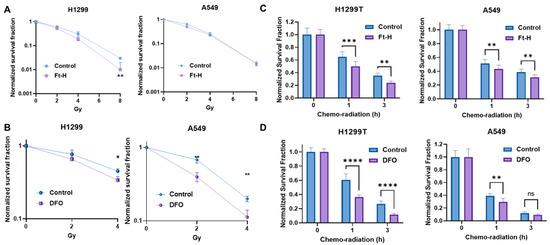 The induction of replication stress is an efficient strategy with which to enhance tumor cell killing and the response to therapy [32,33,34]. Thus, it was hypothesized that LIP depletion could enhance the effectiveness of radiation and chemotherapy. Consistently, Ft-H overexpression sensitizes H1299T cells to ionizing radiation, but not A549 cells (Figure 4A). Alternatively, iron chelation by DFO sensitizes both cells to radiation treatment (Figure 4B). Interestingly, there DFO had a stronger effect on the A549 cells compared to the H1299T cells in terms of iron chelation-induced radio-sensitization.
