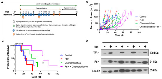A subcutaneous xenograft model system was utilized to test the effects of Ft-H overexpression on H1299T responses to radiation and chemotherapy in vivo using the protocol shown in Figure 5A. Tumor volumes from each treatment group were measured and plotted versus the day of treatment (Figure 5B). The tumor volumes were used to determine survival, and the mice with tumors that measured ≥1.5 cm in any direction on consecutive days were euthanized, as specified in the protocol. The Kaplan–Meier survival curves show that the median overall survival (24 days) for the control and Dox-Ft-H groups were not significantly different. However, Ft-H overexpression slowed tumor growth (p = 0.06) and significantly enhanced the therapeutic responses to cisplatin/etoposide + 10 × 2 Gy radiation (median overall survival, 44 d vs. 65 d; p < 0.05, Figure 5C). For the in vivo validation of overexpression, four tumors were collected at euthanasia and, similar to the in vitro results shown in Figure 1B, a Western blot confirmed the overexpression of the Ft-H and the associated increase in TfR-1 expression (Figure 5D). These data support the hypothesis that LIP depletion by the overexpression of the Ft-H enhanced the effectiveness of radiation and chemotherapy in vivo.