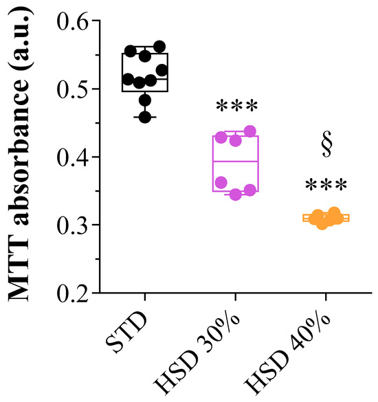 Measurements of mitochondrial activity with MTT (3-(4,5-dimethylthiazol-2-yl)-2,5-diphenyltetrazolium bromide) assay absorbance in adult D. melanogaster head extracts after ten days of feeding with a standard diet (STD, 5–9% sucrose), a high sucrose diet (HSD) of 30%, and a very HSD of 40%, according to the method previously published [43]. Data representing ca. 100 heads were obtained from at least 5 independent experiments. The statistical significance was evaluated using a one-way ANOVA followed by the Tukey post-test. The results were expressed as means ± SEM. a.u.: arbitrary units. *** p < 0.0001 vs. STD, and § p < 0.01 vs. HSD 30%.