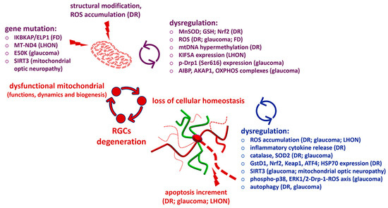 In recent years, different authors have highlighted the importance of oxidative stress in the neurodegeneration of RGC, including those occurring in optic neuropathies and inherited retinal dystrophies, also suggesting future perspectives [12,13]. Of interest, autophagy induction through pharmacological intervention or genetic activation might be a valuable strategy for counteracting redox homeostasis dysregulation in major neurodegenerative diseases, including Alzheimer’s, Parkinson’s, and amyotrophic lateral sclerosis [14]. Given the centrality of this topic, the necessity of investigations on anti-oxidative biomarkers related to neurodegeneration, including retinal neurodegenerations, and the relevance of overviews that compare the results of different investigations to identify the key issues were emphasized [13]. Among them, mitochondrial dysfunction clearly emerged as a fundamental aspect [12,13].