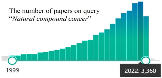 In the last decade, a surge of interest in using the medicinal potential of natural compounds against cancer has been detected [6,7,8], and the number of publications is constantly growing (Figure 1).