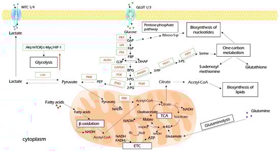 Consequently, glycolysis is modulated by a number of oncogenes. Among others, its major regulators are c-Myc, HIF1α, AKT, and mTOR, which may transactivate glycolytic genes (c-Myc, HIF1α) or can directly and indirectly modulate the activity of enzymes through post-translational modifications and protein–protein interactions [57].