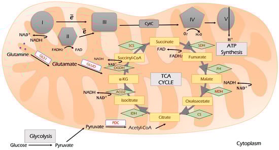 The scheme of the TCA cycle and its coupling with the electron transport chain (ETC). Glycolysis-derived pyruvate enters the TCA cycle through the condensation of acetyl-CoA and oxaloacetate. During the TCA cycle, reducing equivalents NADH and FADH2 are produced, which are oxidized by ETC complexes I and II. Glutaminolysis and β-oxidation of fatty acids are two other sources supplying TCA. Further explanations are provided in the text. I, II, III, IV and V—Respiration Complexes I, II, III, IV and V, respectively; TCA—tricarboxylic acid cycle (Krebs cycle); CS—citrate synthase; IDH—isocitrate dehydrogenase; ACO—aconitase; OGDH—oxoglutarate dehydrogenase; SCS—succinyl coenzyme A synthetase; SDH—succinate dehydrogenase; FH—fumarate hydratase; MDH—malate dehydrogenase; PDC—pyruvate dehydrogenase complex; GLS1—glutaminase 1; GLUD—glutamate dehydrogenase.