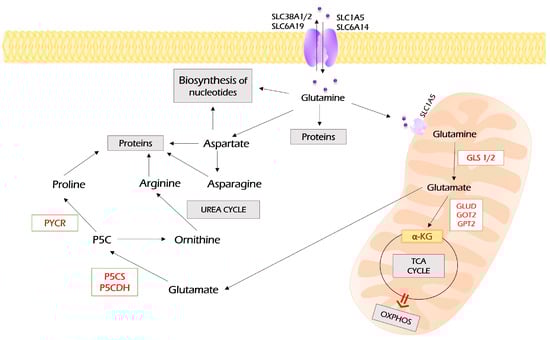 The process of glutamine assimilation occurs in mitochondria and is called “glutaminolysis”. Glutamine is transported to mitochondria by the SLC1A5 variant [72]. Glutaminolysis is catalyzed by glutaminase, which is encoded by two isoforms: GLS1 and GLS2. The cancer-associated glutaminolysis is linked to GLS1, which is overexpressed by various neoplasia [71].