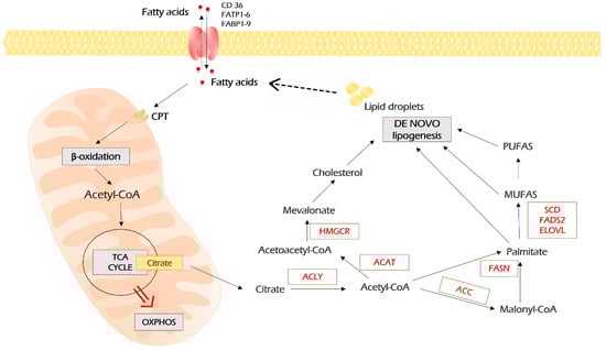 Lipid metabolism in malignant cells. Fatty acids enter malignant cells through a number of importers on the plasma membrane. In addition, in malignant cells, fatty acids can be synthesized de novo through the conversion of citrate, the intermediate of TCA, to acetyl-CoA, which is the precursor of all lipids. In turn, lipids, which are stored as lipid droplets, can be lysed into free fatty acids, which are sources for β-oxidation. In this case, fatty acids are imported into mitochondria by carnitine palmitoyltransferases (CPT 1 and 2), which are localized on the outer and inner mitochondria membrane, respectively. During repeated circles of β-oxidation, fatty acids are broken down to acetyl-CoA monomers, which enter TCA and fuel the energy production by OXPHOS. Further explanations are provided in the text. MUFAs—monounsaturated fatty acids; PUFAs—polyunsaturated fatty acids; FASN—fatty acid synthase; ACC—acetyl-CoA carboxylase; ACLY—ATP citrate lyase; ACAT—acyl-coenzyme A:cholesterol acyltransferases; HMGCR—3-hydroxy-3-methyl-glutaryl-coenzyme A reductase; SCD—stearoyl-CoA desaturase; FADS2—fatty acid desaturase 2; ELOVL—elongation of very long-chain fatty acids protein.