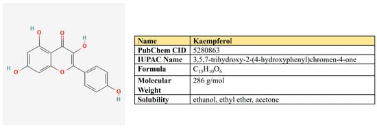 Kaempferol is a flavanol first derived from the rhizome of Kaempferia galanga (Figure 6). This is a non-toxic, low-price dietary ingredient that is fairly well represented in the daily diet. Kaempferol mitigates inflammatory processes and may reduce osteo- and rheumatoid arthritis, colitis, and gastric ulcer [163].