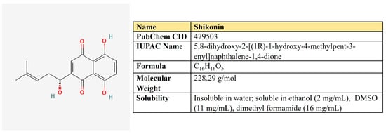 - Yadav, S.; Sharma, A.; Nayik, G.A.; Cooper, R.; Bhardwaj, G.; Sohal, H.S.; Mutreja, V.; Kaur, R.; Areche, F.O.; AlOudat, M. Review of shikonin and derivatives: Isolation, chemistry, biosynthesis, pharmacology and toxicology. Front. Pharmacol. 2022, 13, 905755. [Google Scholar] [CrossRef] [PubMed]