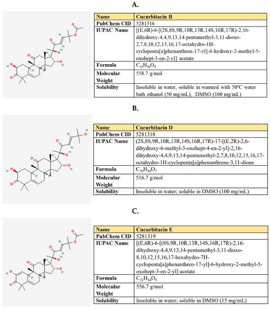- Dai, S.; Wang, C.; Zhao, X.; Ma, C.; Fu, K.; Liu, Y.; Peng, C.; Li, Y. Cucurbitacin B: A review of its pharmacology, toxicity, and pharmacokinetics. Pharmacol. Res. 2022, 187, 106587. [Google Scholar] [CrossRef]