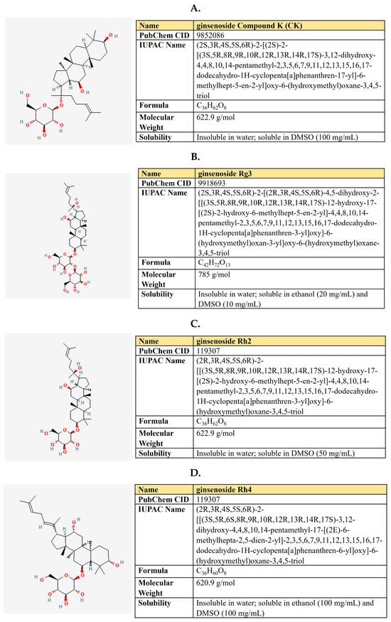 - Hong, H.; Baatar, D.; Hwang, S.G. Anticancer activities of ginsenosides, the main active components of ginseng. Evid. -Based Complement. Altern. Med. 2021, 2021, 8858006. [Google Scholar] [CrossRef]
