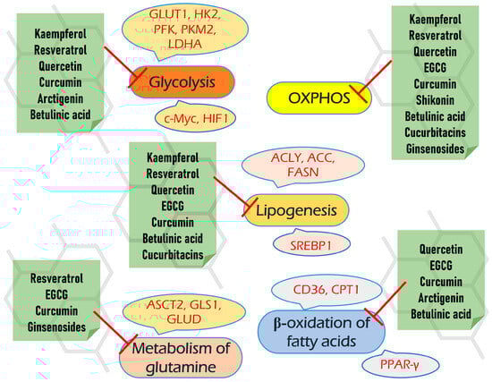 Malignant cells possess great adaptational plasticity and may adapt to the inhibition of certain biochemical or signaling pathways via the fine-tuning bypass and anaplerotic pathways. Thus, we have focused only on a group of plant-derived natural compounds that simultaneously target different aspects of metabolic reprogramming, including aerobic glycolysis, respiration, glutaminolysis, one-carbon metabolism, de novo lipogenesis, and beta-oxidation of fatty acids.