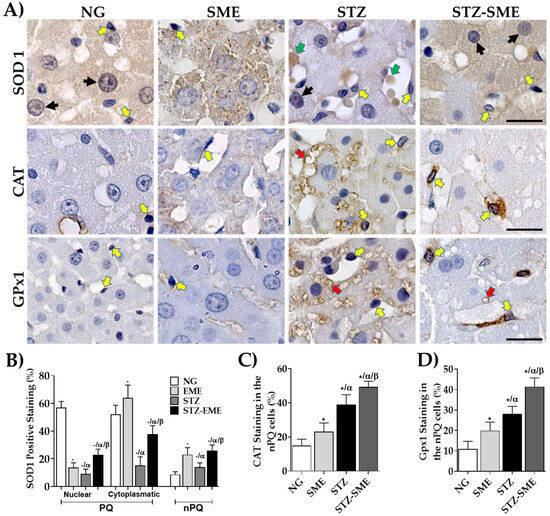 Effect of SME in the distribution of endogenous antioxidant enzymes in liver tissue. Panel (A) shows representative micrographs of immunostaining for superoxide dismutase 1 (SOD1), catalase (CAT), and glutathione peroxidase (Gpx1). The staining percentage for each immunostaining in the NG, SME, STZ, and STZ-SME groups is presented as mean ± SD in panels (B–D) (n = 8). The yellow arrows show positive staining in nPQ cells. Black arrows denote nuclear positive staining in PQ cells. The green and red arrows indicate potential extracellular vesicles and intracellular vacuoles, respectively. * p < 0.05 compared to NG; α p < 0.05 compared to SME; and β p < 0.05 compared to STZ. Scale bar = 20 μm.
