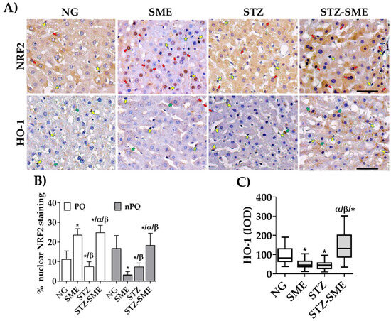 The effects of SME on the hepatoprotective pathway NRF2/HO-1 were evaluated by studying its distribution in PQ and nPQ cells in the different groups (Figure 4A). In PQ cells, the percentage of nuclear staining of NRF2 was higher in the SME group compared to NG (p < 0.05) but not in nPQ cells, where differences were non-significant. In hyperglycemic rats, STZ-SME showed a significantly higher percentage of NRF2 nuclear staining in nPQ and PQ cells than STZ (p < 0.05). Additionally, the STZ-EME group displayed a higher percentage of staining in nPQ cells than in NG and SME (p < 0.05) (Figure 4B).