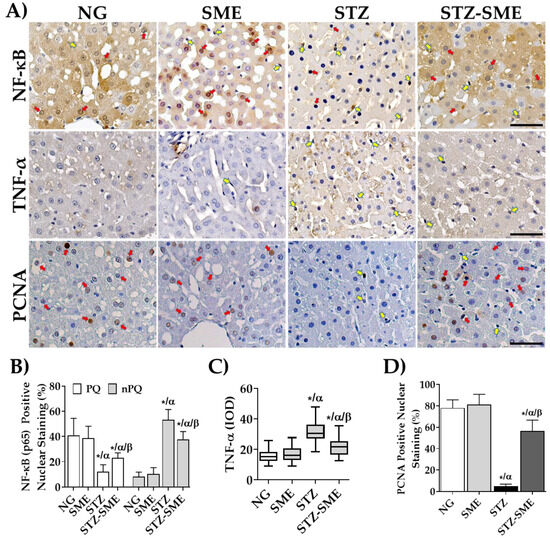 Additionally, it has been observed that nuclear staining of NF-kB was found mainly in the PQ cells of the NG, SME, and SME-STZ livers (as shown in Figure 5A), which could indicate a process of cellular regeneration. Therefore, the percentage of nuclear staining of proliferating cell nuclear antigen (PCNA) in PQ cells was evaluated. Figure 5D shows a higher percentage of nuclear PCNA in NG, SME, and STZ-SME than in STZ (p < 0.05). However, STZ-SME was lower than NG and SME (p < 0.05), but there were no significant differences between NG and SME.