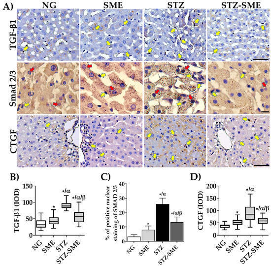 Effect of SME on liver fibrogenesis. Panel (A) shows representative images of immunostainings of transforming growth factor-beta1 (TGF-β1, magnifications at 400×), Smad 2/3 protein (at 800×), and connective tissue growth factor (CTGF, at 400×) in NG, SME, STZ, and STZ-SME groups. The IOD (lum/pixel2) is presented in box-and-whisker plots (panels (B,D)), and the percentage of Smad2/3 nuclear staining is shown in panel (C) (mean ± SD; n = 8). Positive staining in nPQ cells is indicated by yellow arrows and red arrows for PQ cells. * p < 0.05 compared to NG; α p < 0.05 compared to SME, and β p < 0.05 compared to STZ. Scale bar = 50 μm.