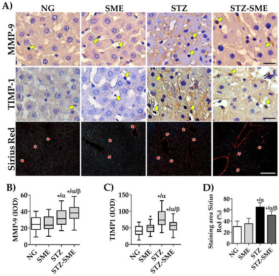 This study also investigated the impact of TGF-β/SMAD3 pathway activation on liver fibrogenesis by analyzing the distribution and expression levels of tissue inhibitors of metalloproteinase-1 (TIMP1) and matrix metalloproteinase-9 (MMP-9). The findings showed that SME affected expression levels of TIMP1 and MMP-9 (Figure 7). In STZ-SME, MMP-9 staining was mainly observed in nPQ cells and the sinusoidal zone’s extracellular space (Figure 7A). In contrast, MMP-9 staining levels were significantly lower in PQ and nPQ cells in STZ (p < 0.05). Conversely, TIMP1 staining was higher in STZ than in STZ-SME (p < 0.05), with a more intense localization in nPQ cells and extracellular matrix. We observed a decrease in this marker in NG compared to the SME (p < 0.05).