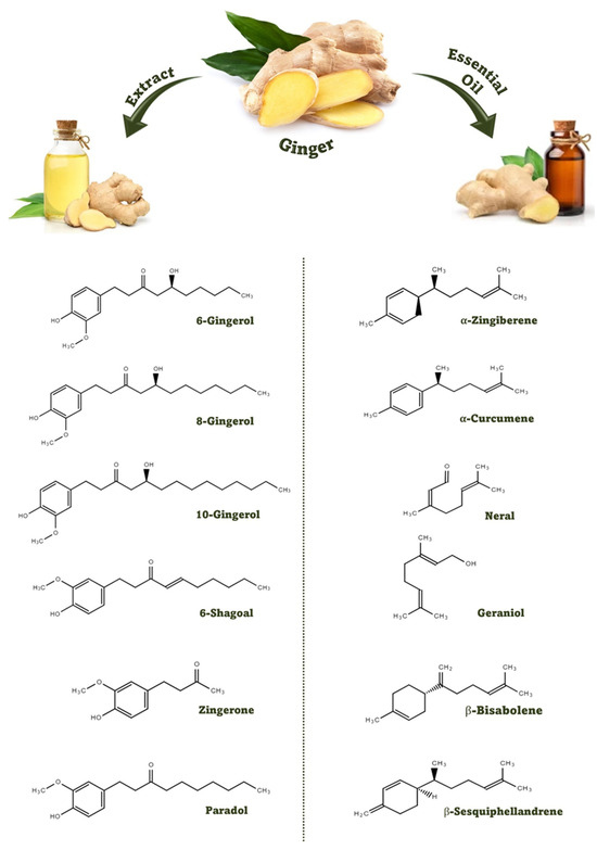 The bioactive composition of ginger essential oil, mainly comprising the volatile oils of ginger, is different than ginger extract. The functional compounds of ginger essential oil are classified into two main groups: monoterpenes and sesquiterpene hydrocarbons. The chemical composition of ginger essential oil is also affected by the nature (fresh or dried) and source of ginger rhizome [5]. The most abundantly available bioactive compounds of ginger essential oil are α-curcumene, α-zingiberene, geranial, β-sesquiphellandrene, β-bisabolene, and neral. Ginger essential oil has also been characterized by a diversified extent of bioactivity and health-promoting properties [24].