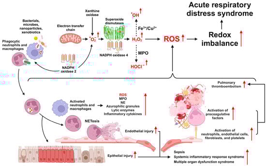The overproduction and accumulation of ROS in ARDS can be attributed to several key factors, including the accumulation of leukocytes, elevated levels of nicotinamide adenine dinucleotide phosphate (NADPH) oxidases (NOXs) and xanthine oxidase (XO), and the use of high-concentration oxygen during mechanical ventilation. A defining characteristic of ARDS is the excessive infiltration of neutrophils and macrophages into the lung tissue [47,77]. Leukocytes play an essential role in the host defense against pathogens and contribute to the initiation and amplification of inflammatory responses by migrating to sites of infection and inflammation, engaging in phagocytic activity, and producing inflammatory mediators [78]. Neutrophils, monocytes, and macrophages employ NOX2 to generate MPO and ROS during their phagocytic actions (Figure 1). Furthermore, the presence of ROS is closely linked to the prognosis of sepsis, a primary cause of ARDS [79]. Contemporary research focuses on understanding the mechanisms underlying ARDS and exploring treatments using various preclinical models. Numerous studies have documented ROS generation in ARDS models and have shown that reduced ROS production can alleviate the lung damage associated with ARDS (refer to Table 1 for details).