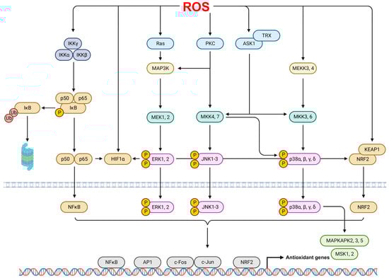 ROS-mediated signaling pathways. The signaling pathways involving ROS include the activation of NFκB and MAPK pathways. Specifically, ROS can activate NFκB through the phosphorylation of IκB and induce the phosphorylation of the MAPK pathway, which includes JNK, ERK, and p38 MAPK. Consequently, these activations promote the nuclear translocation of transcriptional factors such as NFκB, AP-1, c-Fos, c-Jun, and NRF2. These factors contribute to the regulation of genes associated with oxidant defenses.