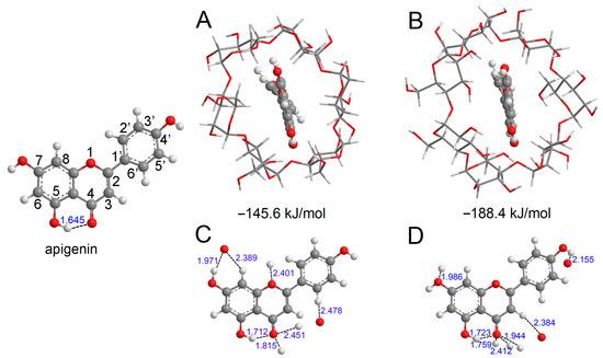 Before proceeding with the analysis of various molecular descriptors, we conducted an exploration of the conformational properties of apigenin and the CD−apigenin complex. The most stable structures of the α−CD−apigenin complex and the β−CD−apigenin complex are depicted in Figure 1A,B, respectively, with the respective interaction energies indicated below the structures. Notably, the interaction between β−CD and apigenin is observed to be stronger than that between α−CD and apigenin. Hydrogen bonding is an important interaction in the inclusion process. We employed the sum of van der Waals atomic radii for hydrogen and oxygen (2.5 Å) to determine the presence of hydrogen bonds in the CD−apigenin complex [42]. For the purpose of this study, our subsequent analyses primarily focused on apigenin. To provide a clearer visualization, Figure 1C,D display only apigenin and the interacting atom of CD.