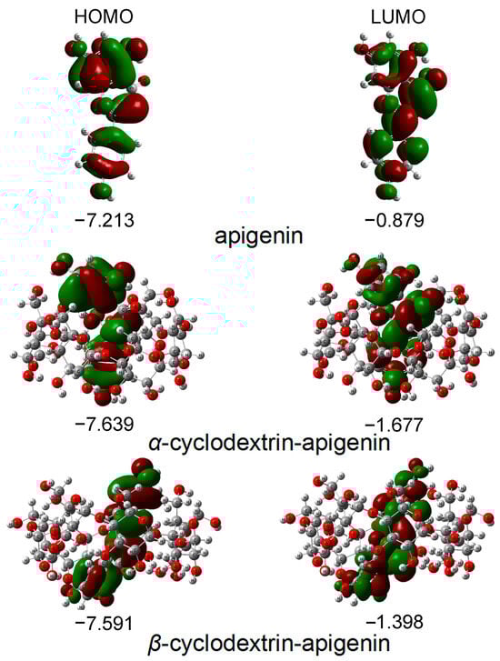 The energy of the HOMO serves as a crucial parameter in representing the antioxidative activity of phenolic compounds, capturing both hydrogen atom/proton donation and electron transfer processes employed to trap free radicals. Phenolic compounds with higher HOMO energy exhibit stronger antioxidative activity. Figure 2 illustrates that the apigenin monomer possesses the highest HOMO energy, succeeded by β−CD−apigenin and α−CD−apigenin. This finding unequivocally establishes apigenin monomer as having the most robust electron-donating capability. The complexation with cyclodextrins, particularly α−CD, diminishes the electron-donating potential of apigenin.