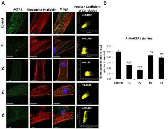 ACTA1 expression levels by immunofluorescence microscopy in control and NM cells. (A) Control (C1) and NM cells (P1, P2, P3, and P4) were immunostained against ACTA1 and visualized under a fluorescence microscope. Nuclei were revealed by DAPI staining. The colocalization between ACTA1 signal and F-actin staining by rhodamine–phalloidin was analyzed by Pearson correlation coefficient. Pearson correlation coefficient was calculated with a DeltaVision system. A positive correlation was considered when Pearson coefficient > 0.75. (B) Quantification of ACTA1 signal. Images were taken using a 60× lens and processed by ImageJ software. *** p < 0.001 between NM and control cells. Scale bars = 20 µm; n.s = no significant.