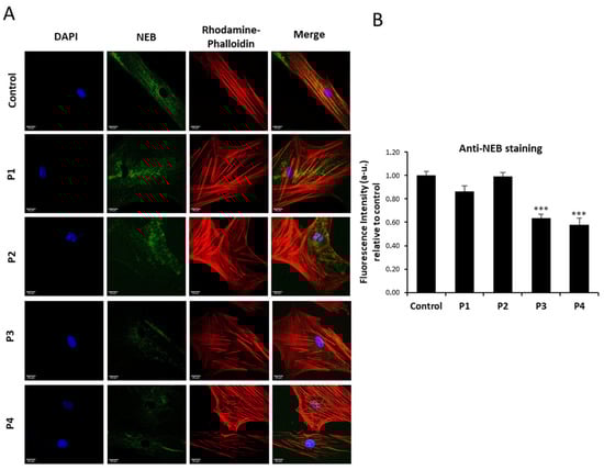NEB expression levels by immunofluorescence microscopy in control and NM cells. (A) Control (C1) and NM cells (P1, P2, P3, and P4) were immunostained against NEB and visualized under a widefield fluorescence microscope. Nuclei were revealed by DAPI staining. (B) Quantification of NEB signal. Images were taken using a 40× lens and processed by ImageJ software. *** p < 0.001 between NM and controls cells. Scale bars = 20 µm.