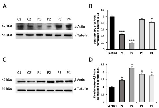 Protein expression levels of α-actin and β-actin NM cells. (A) Cellular extracts from controls (C1 and C2) and NM patient cell lines P1, P2, P3, and P4 were subjected to immunoblotting analysis. An SDS polyacrylamide gel was used to separate protein extracts (50 μg), then the samples were immunostained using antibodies against ACTA1 and α-tubulin, which was used as a loading control. (B) Densitometry of the Western blotting. (C) Cellular extracts from controls (C1 and C2) and NM patient cell lines P1, P2, P3, and P4 were subjected to immunoblotting analysis. An SDS polyacrylamide gel was used to separate protein extracts (50 μg), then the samples were immunostained using antibodies against β-actin and α-tubulin, which was used as a loading control. (D) Densitometry of the β-actin Western blotting. Data represent the mean ± SD of three separate experiments. * p < 0.05, *** p < 0.001 between NM cells and controls. a.u., arbitrary units.
