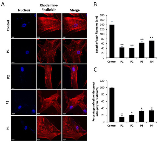 Actin staining by rhodamine–phalloidin of control and NM fibroblasts. (A) Control and NM fibroblasts, P1 and P2 (mutation in ACTA1) and P3 and P4 (mutation in NEB), were stained with rhodamine–phalloidin and visualized under a widefield fluorescence microscope. Nuclei were revealed by DAPI staining. NM fibroblasts (P1, P2, P3, and P4) presented smaller and unstructured actin filaments compared to control fibroblasts. Images were taken using a 40× lens and processed by ImageJ software. (B) Measurement of the length of actin filaments (μm). The length of the actin filaments was measured in triplicate with ImageJ software in 30 images. (C) Percentage of cells with correct actin polymerization. Three counts of 100 cells per sample were performed. * p < 0.05, ** p < 0.01 between NM and controls cells. Scale bar = 20 µm.
