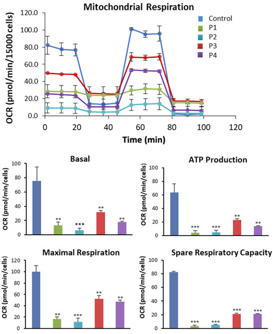 Bioenergetics analysis of control and NM fibroblasts. NM fibroblasts (P1, P2, P3, and P4) and controls (C1 and C2) were examined for basal and maximum respiration, mitochondrial ATP generation, and spare respiratory capacity measured using the Seahorse analyzer. The results were standardized to 15,000 cells according to the instructions in the Material and Methods. ** p < 0.01, *** p < 0.001 between NM and controls cells.