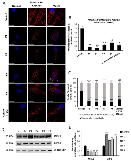 After labeling mitochondria with MitotrackerTM Red CMXRos, we proceeded to investigate the morphology of the mitochondrial network by fluorescence microscopy. Figure 8A illustrates representative images of the mitochondrial shape. A total of 100 cells were quantified for each condition (Figure 8B). The mitochondrial network morphology of mutant fibroblasts (P1, P2, P3, and P4) showed the presence of depolarized and fragmented mitochondria. Therefore, mitochondrial fragmentation was evaluated calculating the percentage of rounded and tubular mitochondria. Comparing NM cells to control cells, we found a significant decrease in tubular mitochondria (Figure 8C). Carbonyl cyanide monochlorophenylhydrazon (CCCP), 100 µM, was applied to control cells for four hours as a positive control of mitochondrial depolarization.