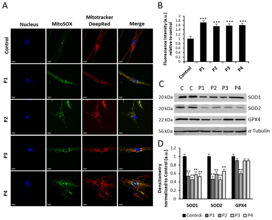 Expression levels of ROS and antioxidant enzymes in NM cells. (A) Representative images of control (C1) and NM fibroblasts (P1, P2, P3, and P4) stained with MitoSOX™ Red and MitoTrackerTM DeepRed. Nuclei were revealed by DAPI staining. Images were taken under a widefield fluorescence microscope using a 40× lens and processed by ImageJ software. Scale bar = 20 µm. (B) Fluorescence quantification of MitoSOX™ Red signal. Data represent the mean ± SD of three separate experiments (at least 100 cells for each condition and experiment were analyzed). (C) Cellular extracts from controls (C1 and C2) and NM patient cell lines P1, P2, P3, and P4 were subjected to immunoblotting analysis. An SDS polyacrylamide gel was used to separate protein extracts (50 μg), then the samples were immunostained using antibodies against SOD1, SOD2, and GPX4. α-Tubulin was used as a loading control. (D) Densitometry of the Western blotting. For control cells (C1 and C2), data are the mean ± SD of the two control cell lines. Data represent the mean ± SD of three separate experiments. ** p < 0.01, *** p < 0.001 between NM and controls cells. a.u., arbitrary units.