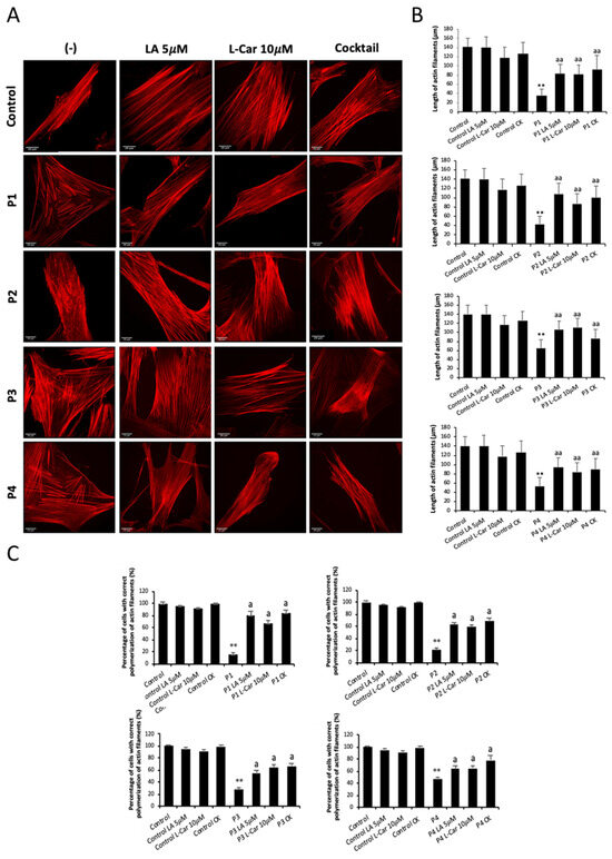 Effect of LA and LCAR on actin polymerization in control and NM cells. Control and NM fibroblasts were treated with 5 μM LA and 10 μM LCAR individually or in combination (Cocktail) for 7 days. (A) Representative images of treated and untreated (-) control and NM fibroblasts, P1 and P2 (mutation in ACTA1) and P3 and P4 (mutation in NEB) stained with rhodamine–phalloidin. Images were taken using a 40× lens and processed by ImageJ software. Scale bar = 20 µm. (B) Measurements of the length of actin filaments (μm). The length of the actin filaments was measured in triplicate with ImageJ software in 30 images. (C) Percentages of cells with correct actin polymerization. Three counts of 100 cells per sample were performed. ** p < 0.01 between NM and control cells; a p < 0.05, aa p < 0.01 between untreated (-) and treated NM cells.