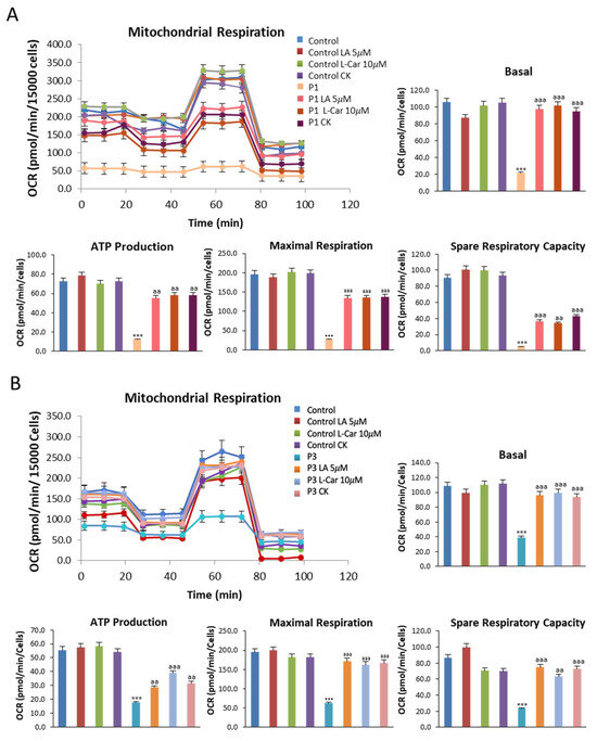 Effect of LA and LCAR on bioenergetics of control and NM fibroblasts. Control (C1) and NM fibroblasts (P1 and P3) were treated (+) with 5 μM LA and 10 μM LCAR individually or in combination for 7 days. Basal and maximal respiration, mitochondrial ATP production, and spare respiratory capacity were determined in controls (C1 and C2) and NM fibroblasts (P1 and P3) by using the Seahorse analyzer and normalized to 15,000 cells as described in the Material and Methods. (A) Corresponding with P1; (B) corresponding with P3. Data represent the mean ± SD of three separate experiments. *** p < 0.001 between NM and controls cells; aa p < 0.01, aaa p < 0.001 between untreated (-) and treated NM cells.